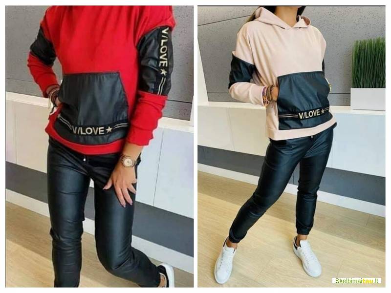 Jaunatviškas laisvalaikio kostiumas. Kelnės ir džemperio dalis iš eko odos. Kelnės su kišenėmis, apačia patraukta. Dydžius, išmatavimus rasite www.uzsukpasmus.lt