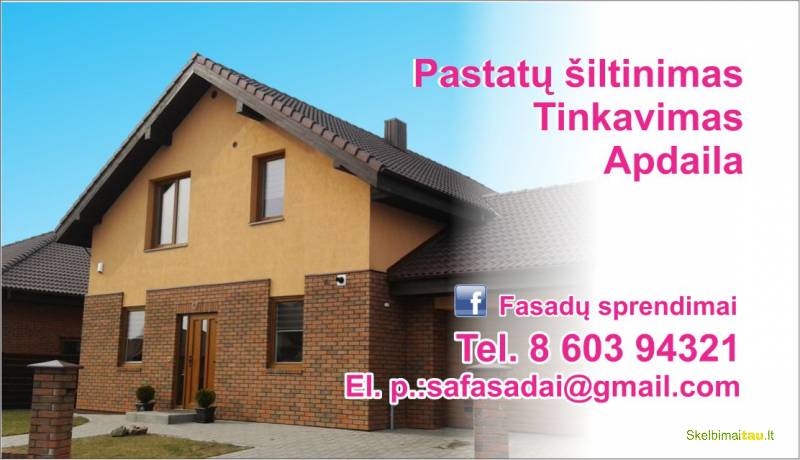 Šiltiname fasadus,tinkuojame dekoratyviniais tinkais,klijuojame klinkeri,keičiame stogų dangas, montuojame lietaus sistemas, atliekame vidaus tinkavima ir apdaila, pristatome medziagas Klaipėdos apskrityje, visa informacija tel.860394321 messenger, viber, whatsapp arba el. p.safasadai@gmail.com
