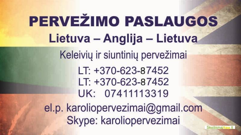 Vežame keleivius, siuntinius, motociklus, traluojame automobilius į/iš ANGLIJOS. Siuntinius pristatome į visus Lietuvos miestus.