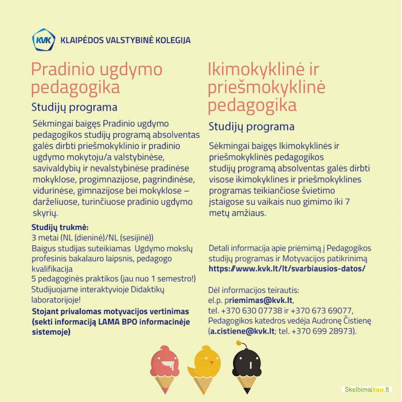 Detali informacija apie priėmimą į Pedagogikos studijų programas ir Motyvacijos patikrinimą https://www.kvk.lt/svarbiausios-datos/