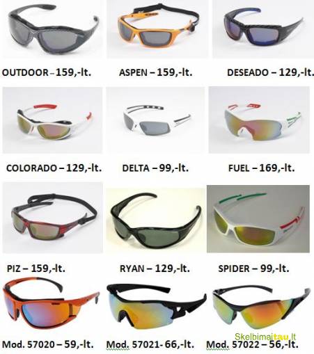 Parduodame nuolat akinius nuo saulės tinkančius aktyviam laisvalaikiui, sportui ant vandens, kelionėms kalnuose, vairavimui ir pan. Savybės: nesibraižantys, nerasojantys, priešrūkiniai, 100% UV, poliarizuoti, su keičiamais lešiais, automatiškai tamsėjantys (fotochrominiai) ir t.t. Atstovaujame „Alpine“- Čekija, „Demon“- Italija, „Carve“ - Prancūzija - prekinius ženklus. Galimas pirkimas internetu.